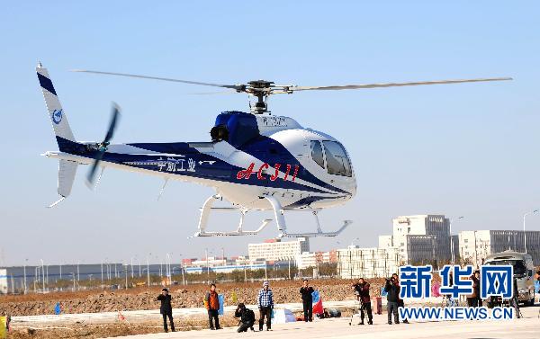 由中國航空工業集團公司自主研制的國產輕型多用途直升機AC311在中航直升機天津分公司完成總裝下線,于11月8日在天津成功首飛。AC311直升機的首飛成功、由天津總裝的首架AC301直升機實現客戶接機,標志著中國AC系列民用直升機產品開發邁上新臺階。據介紹,AC311直升機是性能優越的2噸級輕型多用途直升機,可廣泛應用于飛行訓練、人員運輸、公安執法、通信指揮、航拍攝影、醫療救護、電力巡線、護林防火、飛播滅蟲等任務。與AC311一同飛行的直升機是同一系列的輕型直升機AC301。AC301是天津基地完成總裝的首架直升機,將由中國飛龍通用航空公司接收并投入運營。新華社記者劉海峰攝