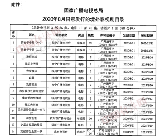 經濟日報-中國經濟網北京9月24日訊 近日,國家廣播電視總局辦公廳公布2020年8月全國引進境外影視劇有關情況,《我的小天使》《大愛晚成》等10部電影及《情有千千結》等3部電視劇作品入選《2020年8月同意發(fā)行的境外影視劇目錄》。