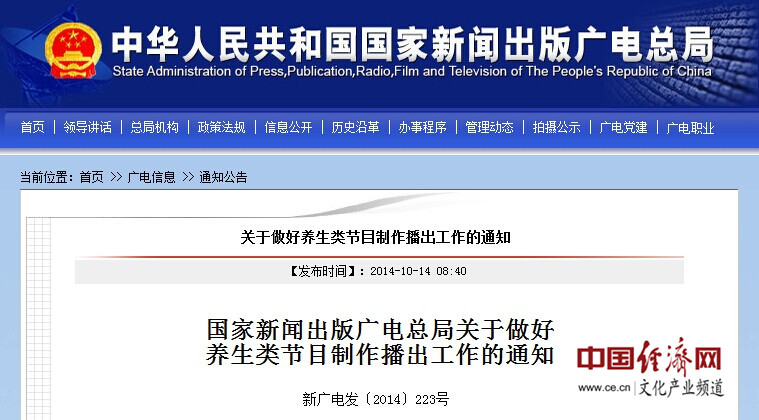 中國經(jīng)濟網(wǎng)北京10月22日訊 中國經(jīng)濟網(wǎng)文化產(chǎn)業(yè)頻道記者從國家新聞出版廣電總局網(wǎng)站獲悉,近日,國家新聞出版廣電總局針對養(yǎng)生類節(jié)目存在夸張宣傳、廣告植入等問題下發(fā)通知,規(guī)范養(yǎng)生類節(jié)目播出秩序。通知要求,電視養(yǎng)生類節(jié)目只能由電視臺策劃制作,不得由社會公司制作,并嚴禁以變相形式發(fā)布廣告等。以下為通知全文。