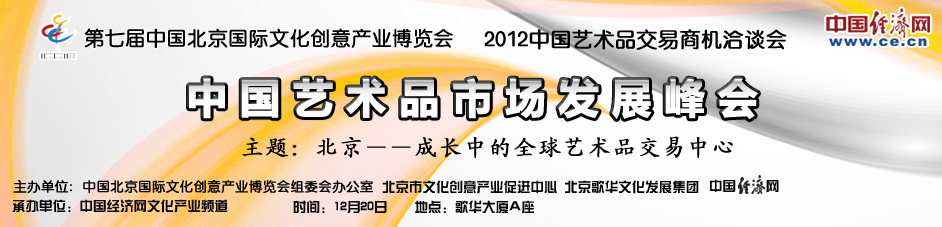 目前,北京藝術(shù)品市場在全球格局中將處于怎樣的定位?藝術(shù)品的稅收問題如何解決?中國藝術(shù)品經(jīng)營及研究機(jī)構(gòu)面臨哪些機(jī)遇和挑戰(zhàn)?文化保稅區(qū)的政策優(yōu)勢如何能促進(jìn)北京藝術(shù)品交易市場的發(fā)展?作為2012第七屆中國北京國際文化創(chuàng)意產(chǎn)業(yè)博覽會重要的活動之一,由北京文化創(chuàng)意產(chǎn)業(yè)促進(jìn)中心、北京歌華文化發(fā)展集團(tuán)和中國經(jīng)濟(jì)網(wǎng)共同主辦,中國經(jīng)濟(jì)網(wǎng)文化產(chǎn)業(yè)頻道承辦的“2012中國藝術(shù)品市場發(fā)展峰會”將于12月在北京舉行,特邀請政府相關(guān)部門及各方人士針對目前北京藝術(shù)品市場發(fā)展現(xiàn)狀和發(fā)展趨勢進(jìn)行直接的交流對話。