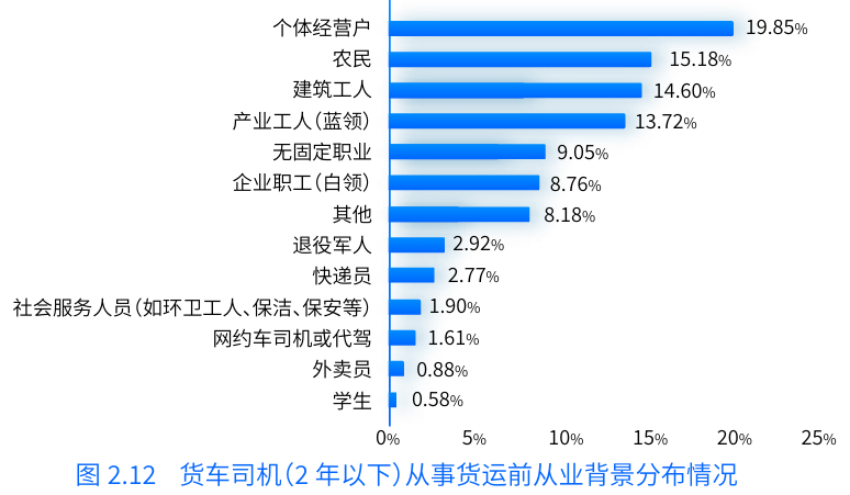不僅如此,報(bào)告中還提到,過(guò)往貨運(yùn)行業(yè)對(duì)傳統(tǒng)行業(yè)從業(yè)者的吸引力較強(qiáng),多為農(nóng)民、個(gè)體經(jīng)營(yíng)戶、產(chǎn)業(yè)工人(藍(lán)領(lǐng))、無(wú)固定職業(yè)、建筑工人等群體。而近幾年,轉(zhuǎn)型從事貨車司機(jī)的職業(yè)還包含了企業(yè)職工(白領(lǐng))、社會(huì)服務(wù)人員、學(xué)生等,另外,外賣員、快遞員、網(wǎng)約車司機(jī)及代駕司機(jī)等新型靈活就業(yè)者也有部分人群選擇轉(zhuǎn)行成為貨車司機(jī)。