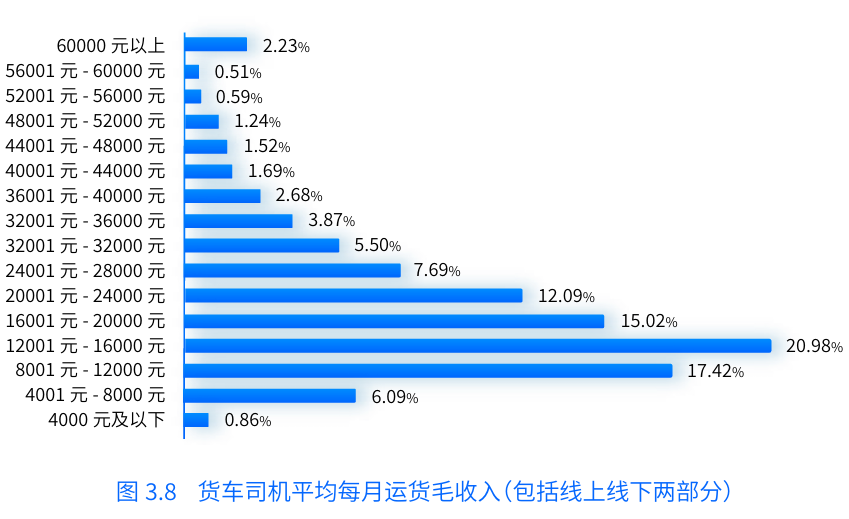 報(bào)告中提到,貨車司機(jī)每月毛收入平均值為20441元。在剔除油(電、氣)費(fèi)、高速費(fèi)、保險(xiǎn)、保養(yǎng)和平臺(tái)信息技術(shù)服務(wù)費(fèi)等成本后,貨車司機(jī)平均月凈收入均值為12063元。