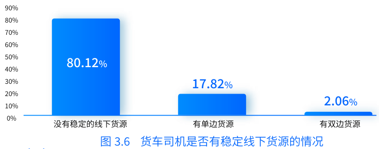 報(bào)告中提到,約80.12%的司機(jī)沒(méi)有穩(wěn)定的線下貨源供應(yīng),貨車司機(jī)很少能夠掌握穩(wěn)定線下貨源。大部分司機(jī)面臨貨運(yùn)工作的不穩(wěn)定性,需要花費(fèi)大量時(shí)間和精力去尋找和獲取貨源,這不僅降低了他們的運(yùn)輸效率,也增加了運(yùn)營(yíng)成本。