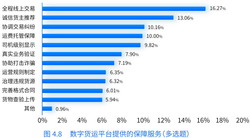 報(bào)告指出,通過(guò)貨車司機(jī)在線上獲取貨源的比例來(lái)衡量他們客觀上對(duì)平臺(tái)的使用情況,發(fā)現(xiàn)貨車司機(jī)使用數(shù)字貨運(yùn)平臺(tái)的程度較高。