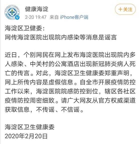 經(jīng)濟日報-中國經(jīng)濟網(wǎng)2月21日訊 (記者朱國旺 郭文培) 近日,個別網(wǎng)民在網(wǎng)上發(fā)布海淀醫(yī)院出現(xiàn)院內(nèi)多人感染、中關(guān)村的公寓酒店出現(xiàn)新冠肺炎病人死亡的傳言。