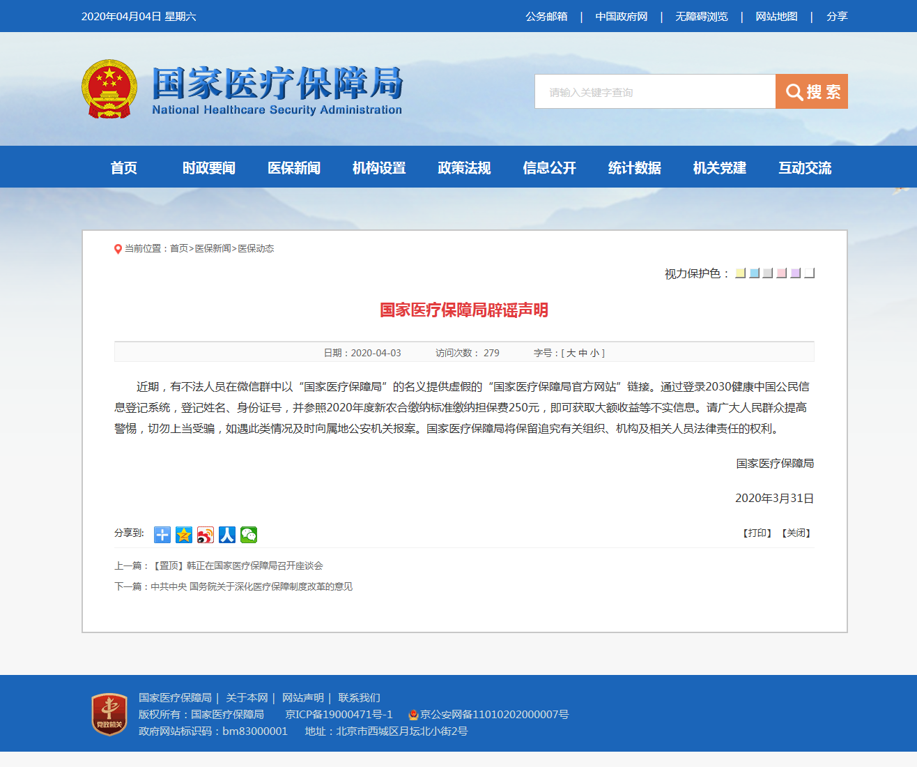 4月3日,國家醫(yī)療保障局發(fā)布辟謠聲明:請廣大人民群眾提高警惕,切勿上當受騙,如遇此類情況及時向屬地公安機關報案。國家醫(yī)療保障局將保留追究有關組織、機構及相關人員法律責任的權利。