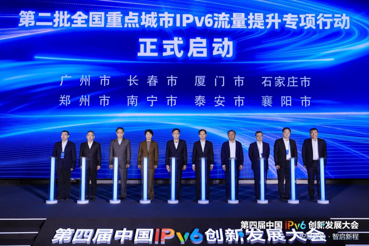 成果發(fā)布環(huán)節(jié),與會(huì)各方共同見(jiàn)證了中央網(wǎng)信辦、工業(yè)和信息化部組織開(kāi)展“全國(guó)重點(diǎn)城市IPv6流量提升專項(xiàng)行動(dòng)”的經(jīng)驗(yàn)和成果,8個(gè)重點(diǎn)城市固定網(wǎng)絡(luò)IPv6流量占比同比增長(zhǎng)63.14%,移動(dòng)網(wǎng)絡(luò)IPv6流量平均占比同比增長(zhǎng)12.37%。中央網(wǎng)信辦信息化發(fā)展局、工業(yè)和信息化部信息通信發(fā)展司及第二批8個(gè)重點(diǎn)城市相關(guān)領(lǐng)導(dǎo),共同啟動(dòng)“第二批全國(guó)重點(diǎn)城市IPv6流量提升專項(xiàng)行動(dòng)”,深化關(guān)鍵環(huán)節(jié)升級(jí)改造,帶動(dòng)全國(guó)IPv6發(fā)展水平再上新臺(tái)階。會(huì)上還發(fā)布了工業(yè)和信息化部、中央網(wǎng)信辦組織開(kāi)展“網(wǎng)絡(luò)去NAT”專項(xiàng)工作的階段性成果:9個(gè)試點(diǎn)地區(qū)基礎(chǔ)電信企業(yè)自有環(huán)境固定寬帶用戶IPv6連通率達(dá)97.52%,試點(diǎn)地區(qū)NAT44設(shè)備容量全面實(shí)現(xiàn)零增長(zhǎng)。后續(xù),相關(guān)部門(mén)將在試點(diǎn)經(jīng)驗(yàn)基礎(chǔ)上,在全國(guó)范圍內(nèi)進(jìn)一步開(kāi)展“網(wǎng)絡(luò)去NAT”專項(xiàng)工作,持續(xù)推動(dòng)網(wǎng)絡(luò)和應(yīng)用的IPv6演進(jìn)升級(jí)。