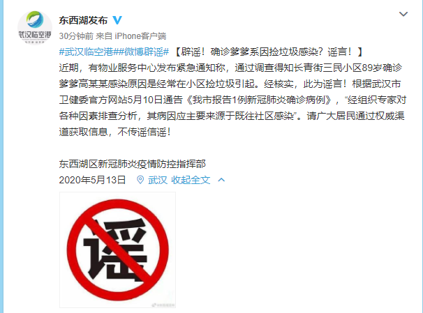據(jù)武漢市東西湖區(qū)人民政府官方微博5月13日消息,近期,有物業(yè)服務(wù)中心發(fā)布緊急通知稱,通過調(diào)查得知武漢市東西湖區(qū)長青街三民小區(qū)89歲確診爹爹高某某感染原因是經(jīng)常在小區(qū)撿垃圾引起。經(jīng)核實(shí),此為謠言。根據(jù)武漢市衛(wèi)健委官方網(wǎng)站5月10日通告《我市報(bào)告1例新冠肺炎確診病例》,“經(jīng)組織專家對各種因素排查分析,其病因應(yīng)主要來源于既往社區(qū)感染”。請廣大居民通過權(quán)威渠道獲取信息,不傳謠信謠!