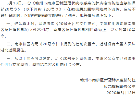 據(jù)中共贛州市南康區(qū)委宣傳部官微“南康發(fā)布”5月19日消息,贛州市南康區(qū)新冠肺炎疫情防控應急指揮部辦公室稱,5月18日,一份《贛州市南康區(qū)新型冠狀病毒感染的肺炎疫情防控應急指揮部20號令》(以下簡稱《20號令》)在微信朋友圈等網(wǎng)絡媒體流傳,造成不良社會影響,南康區(qū)防控指揮部立即進行了調查。現(xiàn)將情況說明如下: