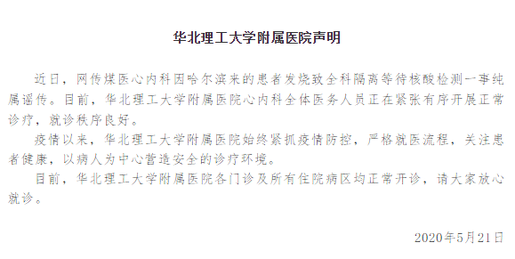 5月21日,華北理工大學附屬醫(yī)院發(fā)布聲明稱,近日,網(wǎng)傳“煤醫(yī)(現(xiàn)為華北理工大學附屬醫(yī)院)心內科因哈爾濱來的患者發(fā)燒致全科隔離等待核酸檢測”一事純屬謠傳。目前,華北理工大學附屬醫(yī)院心內科全體醫(yī)務人員正在緊張有序開展正常診療,就診秩序良好。