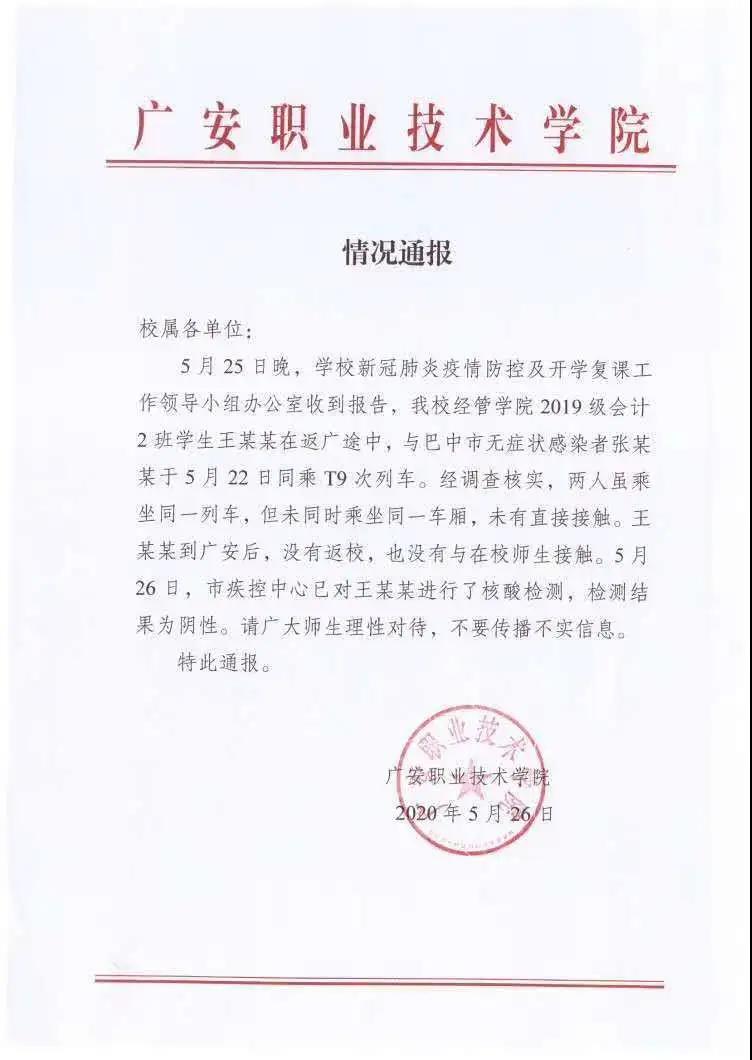 公告稱, 5月25日晚,廣安職業(yè)技術(shù)學(xué)院新冠肺炎疫情防控及開學(xué)復(fù)課工作領(lǐng)導(dǎo)小組辦公室收到報告,該校經(jīng)管學(xué)院2019級會計2班學(xué)生王某某在返廣(安)途中,與巴中市無癥狀感染者張某某于5月22日同乘T9次列車。經(jīng)調(diào)查核實(shí),兩人雖乘坐同一列車,但未同時乘坐同一車廂,未有直接接觸。王某某到廣安后,沒有返校,也沒有與在校師生接觸。5月26日,廣安市疾控中心對王某某進(jìn)行核酸檢測,檢測結(jié)果為陰性。