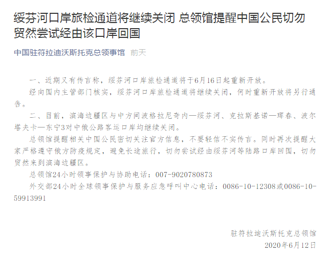 對此,6月12日,中國駐符拉迪沃斯托克總領事館辟謠稱,經向國內主管部門核實,綏芬河口岸旅檢通道將繼續關閉,何時重新開放將另行通告。目前,濱海邊疆區與中方間波格拉尼奇內—綏芬河、克拉斯基諾—琿春、波爾塔夫卡—東寧3對中俄公路客運口岸均繼續關閉。