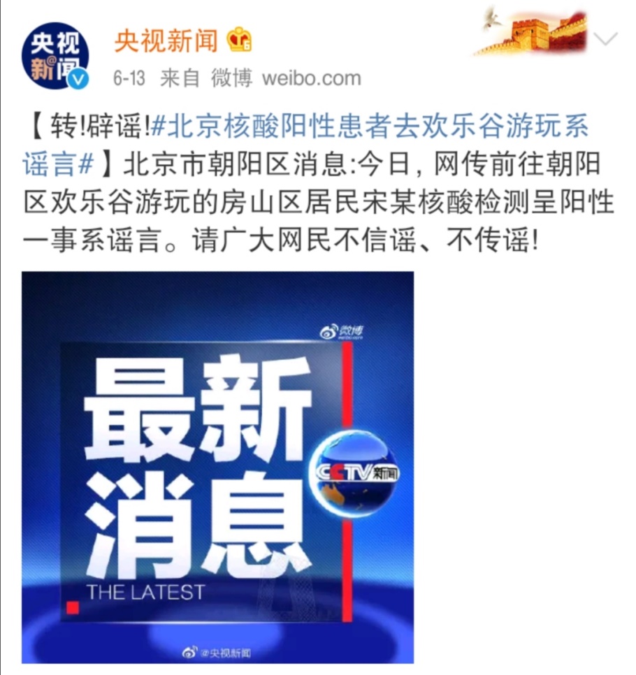 另據@央視新聞,針對“家住房山區的宋某在歡樂谷游玩時發現自己核酸檢測結果呈陽性”一事,北京市朝陽區對此表示,該信息是謠言。