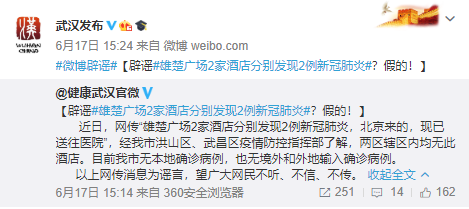 據(jù)武漢市互聯(lián)網(wǎng)信息辦公室17日消息,經(jīng)武漢市洪山區(qū)、武昌區(qū)疫情防控指揮部了解,網(wǎng)傳“雄楚廣場2家酒店分別發(fā)現(xiàn)2例新冠肺炎”系謠言。