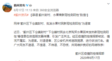 據(jù)天津市薊州區(qū)人民政府官方微博,經(jīng)薊州區(qū)疫情防控指揮部核實,網(wǎng)傳“薊州區(qū)下倉鎮(zhèn)村民去北京買水果回來發(fā)熱,新冠檢測陽性”等信息為謠言。對造謠者,薊州區(qū)公安機關(guān)將追蹤溯源,進行依法打擊。