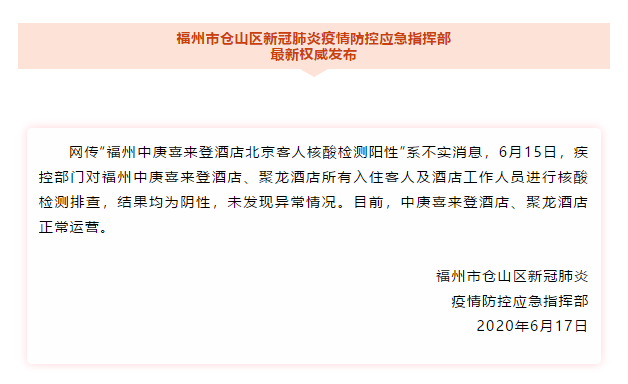 據(jù)《福建日報》官微,福州市倉山區(qū)新冠肺炎疫情防控應(yīng)急指揮部稱,網(wǎng)傳“福州中庚喜來登酒店北京客人核酸檢測陽性”為不實消息。