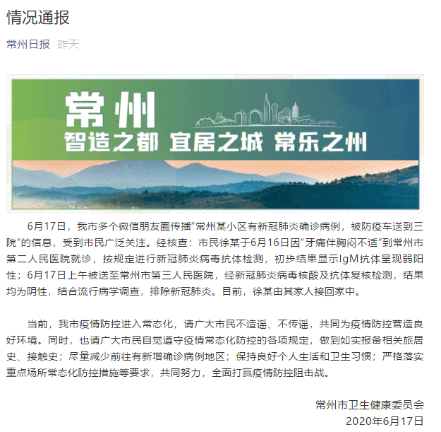 通報稱,6月17日,常州市多個微信朋友圈傳播“常州某小區(qū)有新冠肺炎確診病例,被防疫車送到三院”的信息,受到市民廣泛關(guān)注。經(jīng)核查:市民徐某于6月16日因“牙痛伴胸悶不適”到常州市第二人民醫(yī)院就診,按規(guī)定進行新冠肺炎病毒抗體檢測,初步結(jié)果顯示IgM抗體呈現(xiàn)弱陽性;6月17日上午被送至常州市第三人民醫(yī)院,經(jīng)新冠肺炎病毒核酸及抗體復(fù)核檢測,結(jié)果均為陰性,結(jié)合流行病學(xué)調(diào)查,排除新冠肺炎。目前,徐某由其家人接回家中。