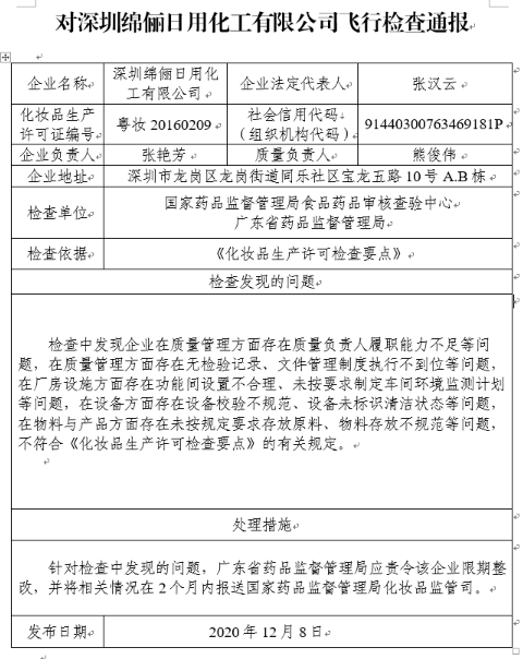 針對檢查中發現的問題,國家藥監局要求廣東省藥品監督管理局應責令深圳綿儷日用化工有限公司限期整改,并將相關情況在2個月內報送國家藥品監督管理局化妝品監管司。