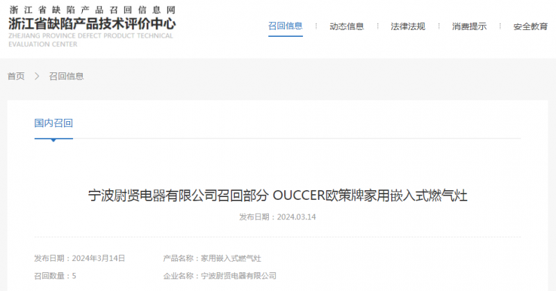 日前,寧波尉賢電器有限公司受缺陷調(diào)查影響按照《消費(fèi)品召回管理暫行規(guī)定》的要求,主動(dòng)向浙江省市場(chǎng)監(jiān)督管理局和寧波市市場(chǎng)監(jiān)督管理局報(bào)告了召回計(jì)劃,將自即日起,召回2023年3月1日期間制造的OUCCER歐策牌JZY-OC20型號(hào)家用嵌入式燃?xì)庠睿婕皵?shù)量為5件。