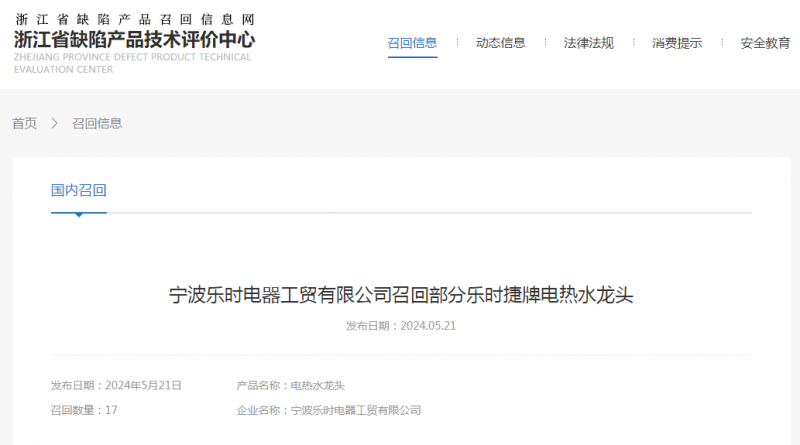 日前,寧波樂(lè)時(shí)電器工貿(mào)有限公司受缺陷調(diào)查影響按照《消費(fèi)品召回管理暫行規(guī)定》的要求,主動(dòng)向浙江省市場(chǎng)監(jiān)督管理局和寧波市市場(chǎng)監(jiān)督管理局報(bào)告了召回計(jì)劃,將自即日起,召回2023年5月27日至2023年5月28日期間制造的樂(lè)時(shí)捷牌ST1X3型號(hào)電熱水龍頭,涉及數(shù)量為17件。