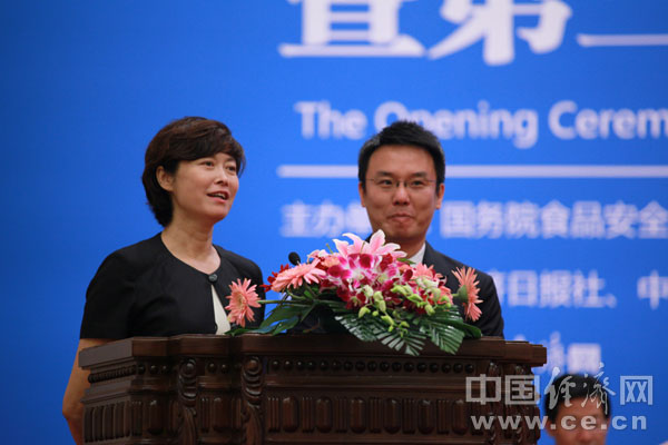 食品安全宣傳周形象大使、著名主持人敬一丹和張羽代表“全國食品安全宣傳周”標識征集活動主辦方宣布中標作品及作者。 攝影/記者 王維亮