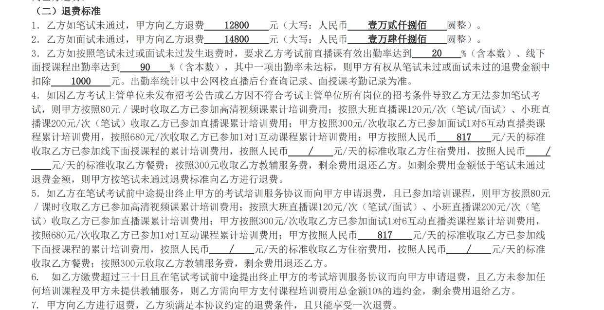 記者在武女士提供的其與中公教育簽訂的協(xié)議書里看到,符合出勤率等其他條件后,如果筆試或面試未通過,中公教育將為學(xué)員全額退款。學(xué)員需在規(guī)定時(shí)間內(nèi)提交相關(guān)材料申請(qǐng)退費(fèi),中公教育核實(shí)所提交材料真實(shí)、符合退費(fèi)條件后,在30至45個(gè)工作日內(nèi)將約定的退費(fèi)金額支付至學(xué)員提供的銀行賬戶。