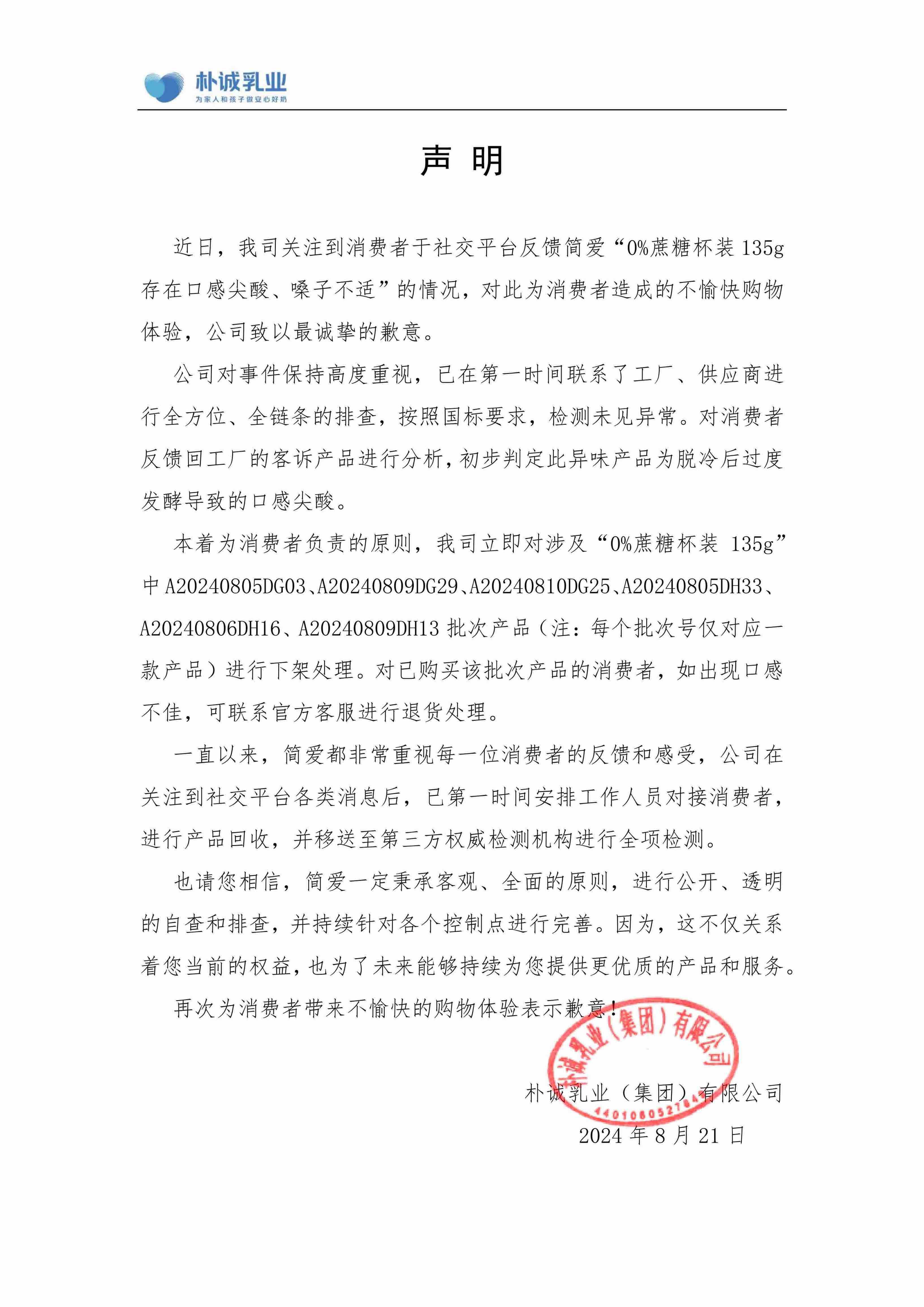 8月22日,樸誠乳業(集團)有限公司相關負責人對記者表示,已經關注到消費者在社交平臺反饋的情況,對此給消費者造成的不愉快購物體驗表示歉意。