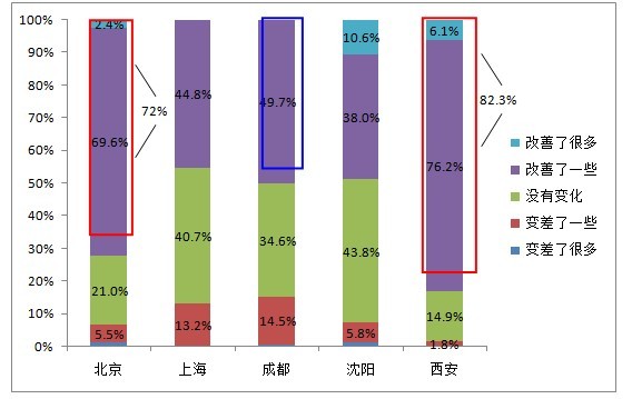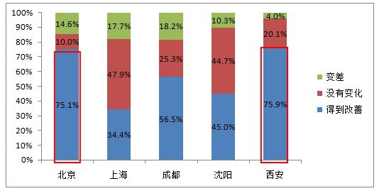 解讀一:過去一年,西安、北京對食品安全的改善情況最為滿意,成都最不滿意。